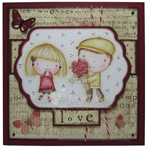 There will be three new Sweet November elves with their pets in April. This is the cute Darby together with Briar's pet Sonata the grasshopper. I soo like it, doesn't it look too cute?! I found a matching sentiment in the C.C. Designs "Froggie and Friends" set which is unfortunately retired nowadays. I stamped the sentiment to the new banner from the C.C. Cutters Banner Strips.