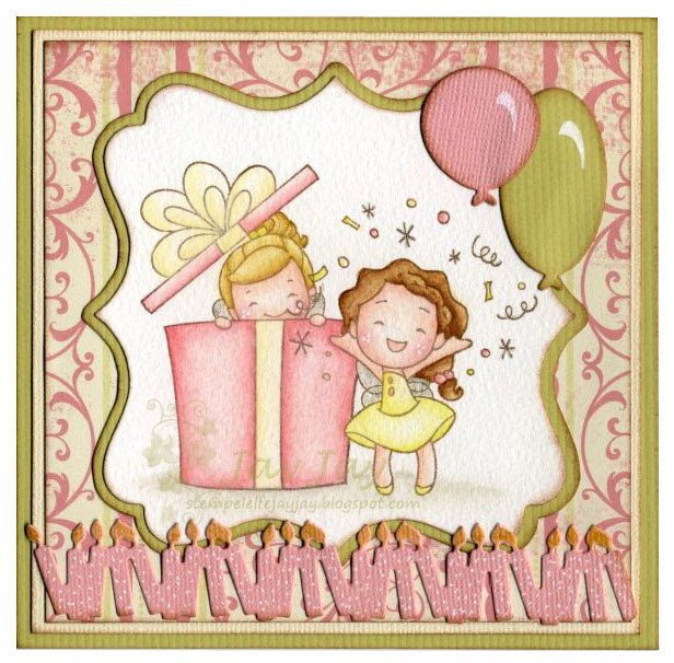 Heehee and beside the 4 new Swiss Pixies and 2 scene images there will be released a matching Woodland Logos set! I adhered a matching mushroom girl laber to my card's backside. I like it!
